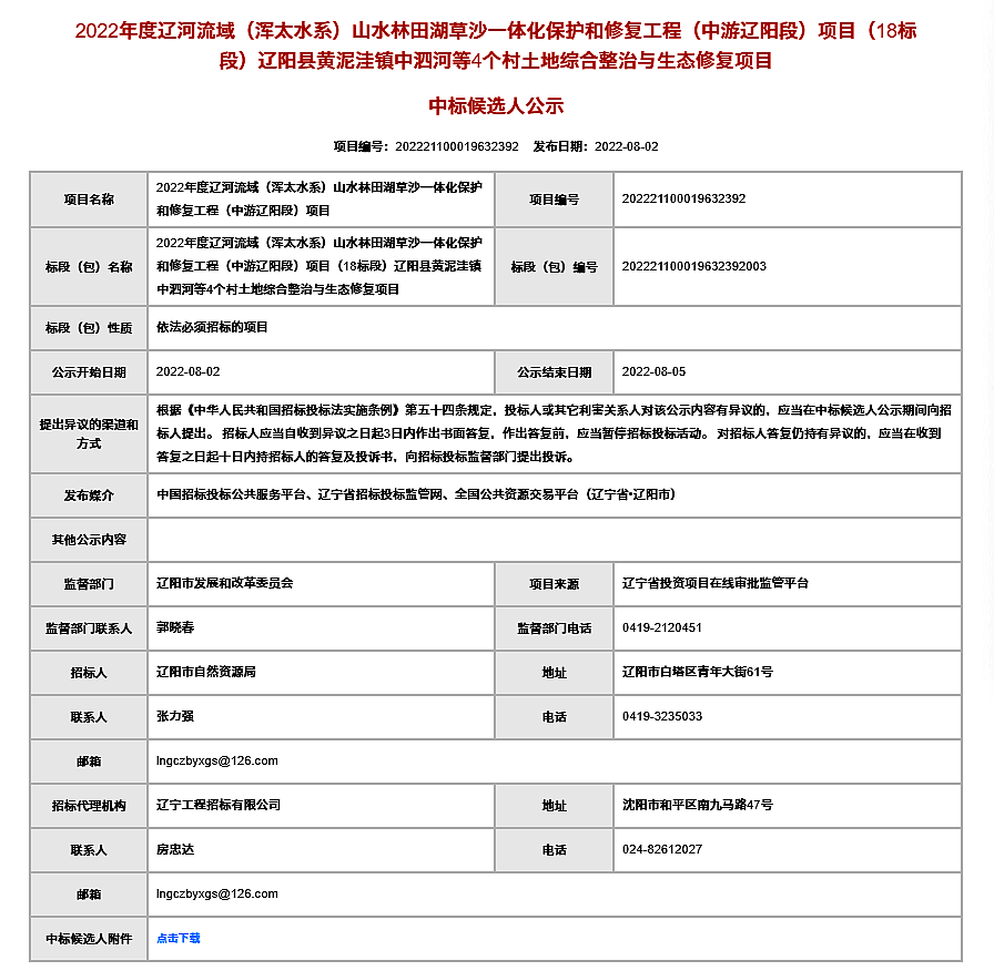 2022年度辽河流域山水林田湖草沙一体化保护和修复工程项目(18标段)辽阳县黄泥洼镇中泗河等4个村土地综合整治与生态修复项目中标